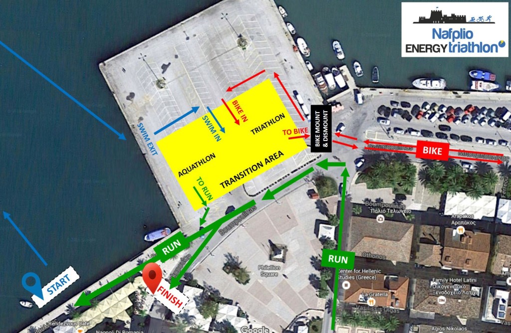 Η “καρδιά του αγώνα”, η περιοχή αλλαγών, θα είναι στο χαρακτηριστικό “Π” του Λιμανιού του Ναυπλίου, το οποίο παρέχει άνετο χώρο για να υποδεχτεί τον εξοπλισμό των τριαθλητών. Αριστερά του “Π”, εντός θαλάσσης θα γίνει η εκκίνηση. Οι διαδρομές τόσο του τρεξίματος όσο και της ποδηλασίας είναι επίπεδες και γρήγορες και προσφέρονται για γρήγορες επιδόσεις, αλλά και για τους νέους φίλους του αθλήματος. Ο τερματισμός θα γίνει στην αρχή της οδού Φαρμακοπουλών αριστερά της Πλατείας Φιλελλήνων, στην οποία επίσης θα στηθούν βοηθητικές εγκαταστάσεις της διοργάνωσης και θα γίνουν και οι απονομές.